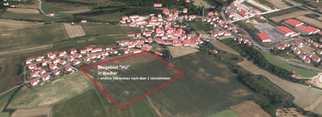 Das Baugebiet „Hu“ in Weiher – eine fast „unendlichen Geschichte“ – hat sich in den letzten 25 Jahren mit haarstäubenden Fehlern und als jahrzehntelanges, ungenutztes „totes Kapital“ als unrühmlicher Beitrag zur Bauland- und Finanzlage der Stadt etabliert.
