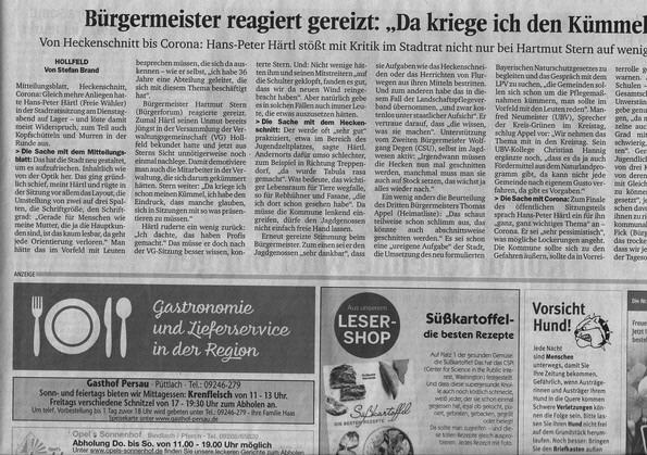 Die darauf folgenden Äußerungen des Bürgermeisters wurden zwar ausführlich dargestellt , seine Reaktion darauf zeigt aber, dass er wohl das Ansinnen von Stadtrat Härtl nicht richtig verstanden hatte. Hier war also weder die Reaktion des Bürgermeister adäquat noch spiegelt die Berichts-Darstellung die tatsächlichen Aussagen wider!