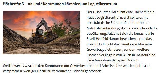 Der Discounter Lidl sucht eine Fläche für ein neues Logistikzentrum. Erst sollte es ins oberfränkische Stadelhofen mit direkter Autobahnanbindung, doch da wehrte sich die Bevölkerung. Jetzt hat sich die benachbarte Stadt Hollfeld darum beworben — und das, obwohl Lidl nicht das bereits erschlossene Gewerbegebiet nutzen, sondern weitere Flächenversiegeln will. Auch in Hollfeld sind viele Anwohner dagegen. Doch im Wettbewerb zwischen den Kommunen um Gewerbesteuer und Arbeitsplätze werden politische Versprechen, weniger Fläche zu verbrauchen, schnell gebrochen.